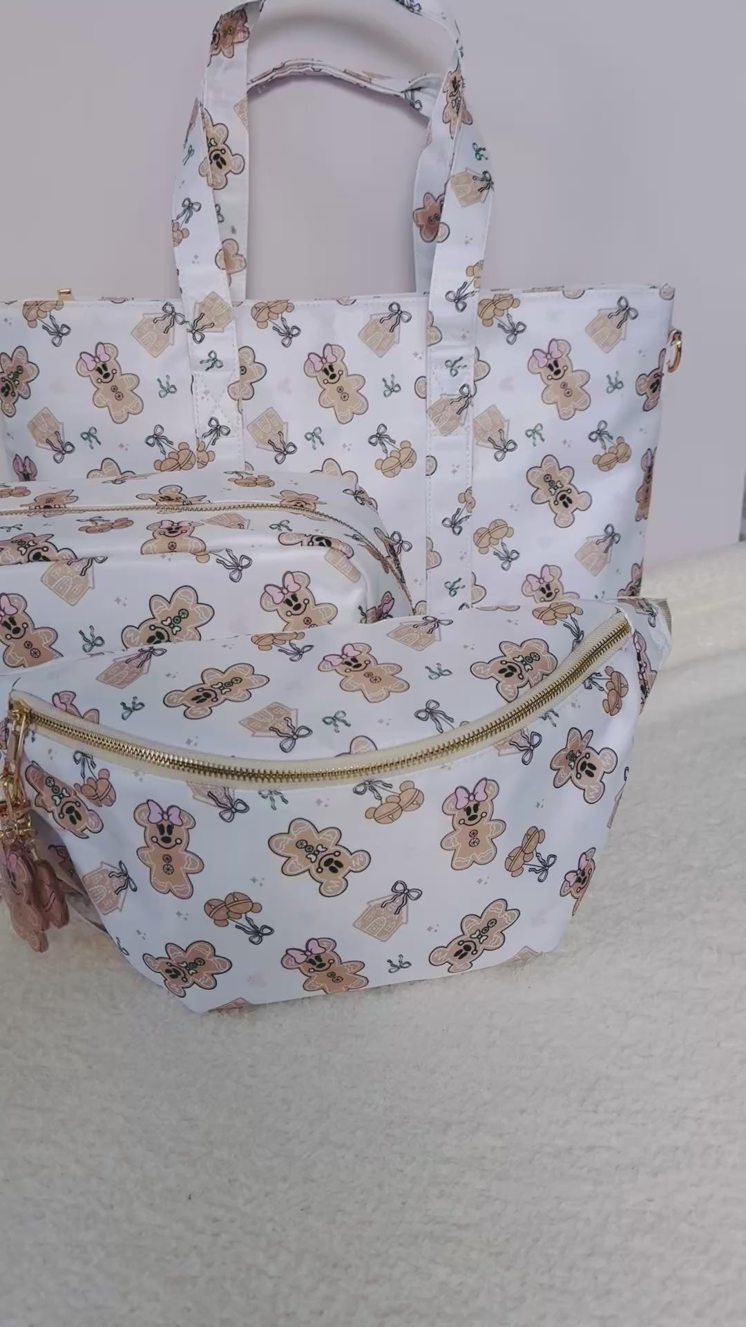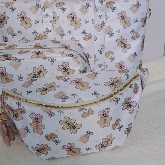 This tote bag matches our Gingerbread Cutie XL pouch, XL belt bag, and bag charm keychains!